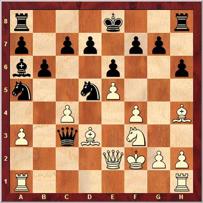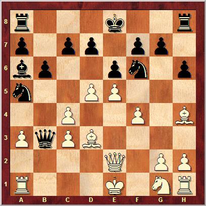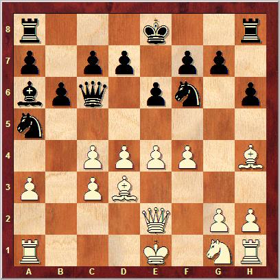 h6 9. Bh4 Qc8 10. Bd3 Na5 11. Qe2 Qb7 12. f4 Qc6 13. d5 Qa4 14. e5 Qb3 15. Kf2